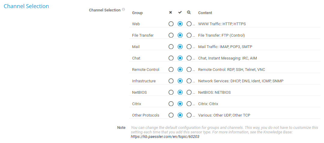 No (): Do not account traffic of this group in its own channel. The sensor accounts all traffic of this group to the default channel named Other.